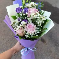 Состав: роза одноголовая -3шт, хризантема сантини - 3шт, лизиантус (эустома) - 1шт, гипсофила -1шт, зелень.