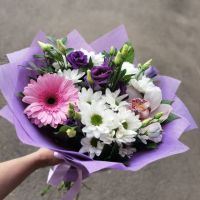 Состав: гербера - 1шт, орхидея - 1шт, хризантема - 3шт, лизиантус -2 шт,  зелень.