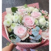 Состав: роза -5 шт, хризантема сантини -3шт, гипсофила - 1шт, бувардия -3шт, зелень.
