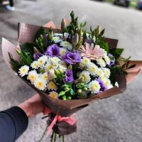Состав: хризантема сантини - 4шт, гербеа мини-1шт., лизиатус (эустома) - 3шт, зелень