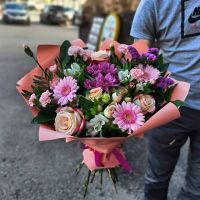 Состав: роза одноголовая - 3шт , роза кустовая - 1шт, гербеа мини - 3шт, гвоздика кустовая -3шт, хризантема - 1шт, альстромерия - 3шт, статица - 1шт, зелень.