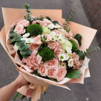 Состав: хризантема сантини - 4 шт., гвоздика - 5 шт., гвоздика грин трик - 3 шт, роза кустовая - 4 шт., роза одноголовая - 3шт, зелень