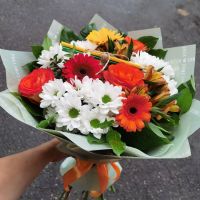 Состав: хризантема - 3шт, роза одноголовая - 3шт, гербера - 3шт, альстромерия– 2 шт, декор, зелень