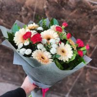 Состав: гербера мини-7шт., хризантема -2 шт, гвоздика кустовая -4шт., зелень