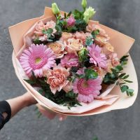 Состав: роза одноголовая – 7 шт.,  гербера мини - 3шт,  гвоздика -5шт, лизиантус -1 шт, эвкалипт, зелень