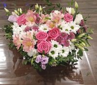 Состав: роза одноголовая - 5 шт., альстромерия – 2 шт., хризантема – 4 шт., хризантема сантини – 3 шт., лизиантус - 2 шт., зелень